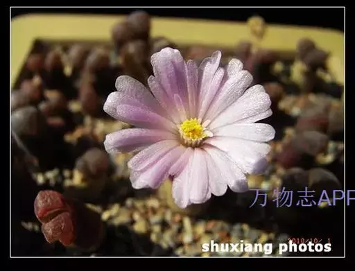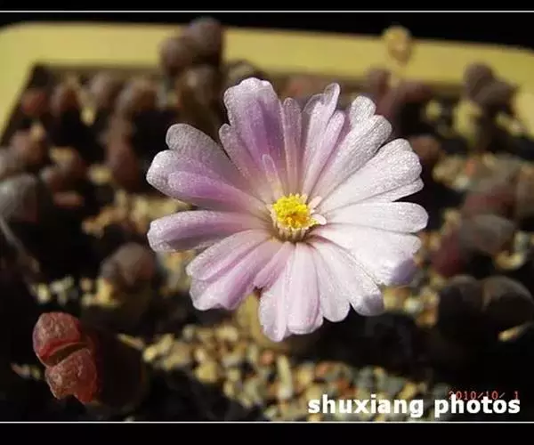 植株单生或群生,单株由对生的极端肉质叶组成近似圆柱体,高2一3厘米,其中下部表皮呈红褐色或白绿色中带有红色。顶端圆凸,表皮极薄,较为光滑,几乎接近透明状,俗称”窗”,光线由此进入植株体内进行光合作用。顶端有一浅缝隙,9一11月初从这里开出直径约2厘米的白色花朵。花通常在天气晴朗的白天开放,傍晚闭合,若遇阴雨天或栽培场所光线不足,则不能开放。