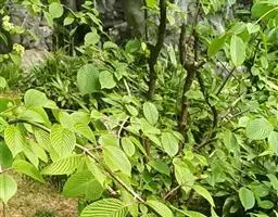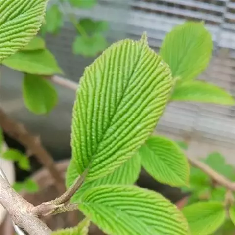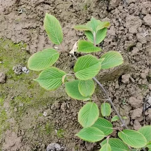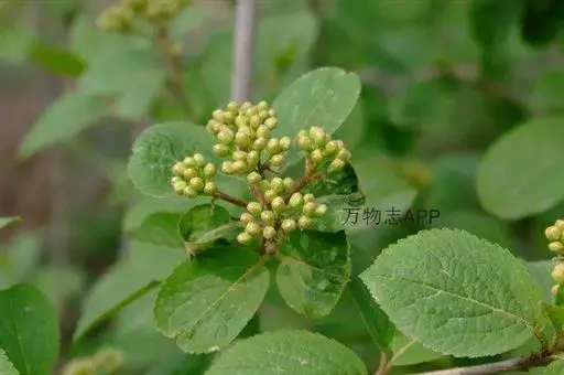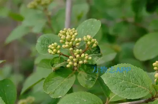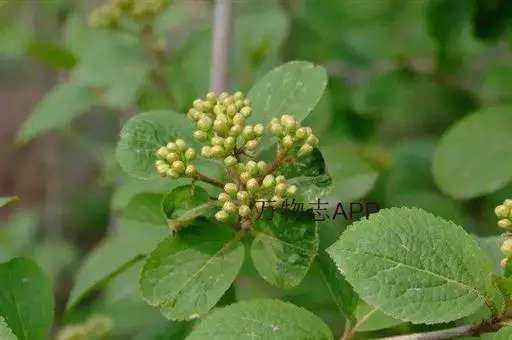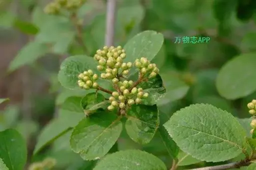 落叶灌木,高达5米,树皮暗灰色;当年小枝、冬芽、叶下面、叶柄及花序均被簇状短毛,二年生小枝黄白色,无毛。叶纸质,宽卵形至椭圆形或椭圆状倒卵形,长(3-)4-6(-10)厘米,顶端尖,稀稍钝,基部钝或圆形,两侧常不等,边缘有牙齿状小锯齿,初时上面疏被簇状毛或无毛,成长后下面常仅主脉及侧脉上有毛,侧脉5-6对,近缘前互相网结,连同中脉上面略凹陷,下面凸起;叶柄长5-12毫米。