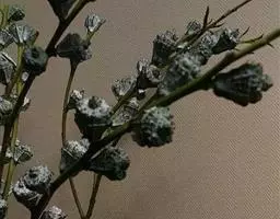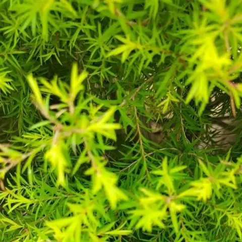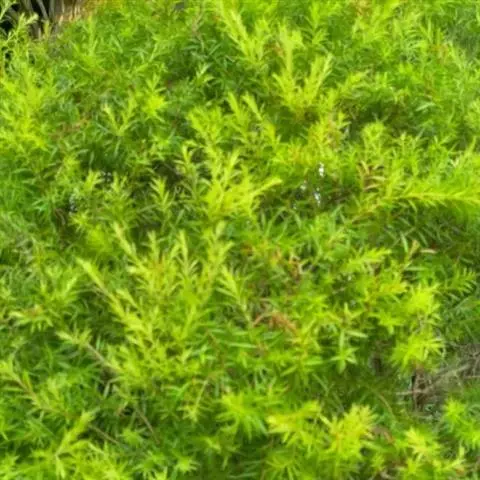 常绿乔木,树高可达6-8米,冠幅锥形。主干直立,枝条密集、细长、柔软,嫩枝红色。树皮纵裂,枝条柔软密集。叶互生,金黄色,窄卵形至卵形,长10-28毫米,宽1.5-3毫米,叶脉5-11,叶尖锐尖到尖,叶无毛或偶有软毛,无叶柄,具芳香味。穗状花序,花序有少到多个尖状花组成,长1.5-3.5厘米,花轴被软毛,同一苞片内有1到3个白色花,花瓣近圆柱形,长1.5-2毫米;每束雄蕊16-25个;花瓣绿白色。果实为蒴果。果近球形,果径2-3毫米,具有一个2毫米直径的孔,萼片宿存。 [1-2]