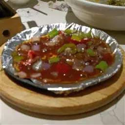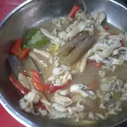 3、将炒锅放置旺火上,将鸡胸肉,猪肚,猪心,火腿肠放炒锅内加泡辣椒,干辣椒会炒至香,加入少许鲜汤,然后放入牛油,香油,味精,鸡精起锅后盛入炒好做底用的辅料上即成。