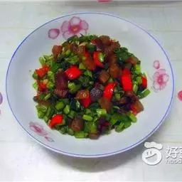 毛血旺(图5) 1、鸭血和午餐方火腿切片切成约5CM厚的大片,百叶洗净,切成梳子形的丝,黄喉切小片。黄豆芽洗净,干辣椒用剪小段倒出籽,小香葱切碎,大葱分别切成葱花和葱段。