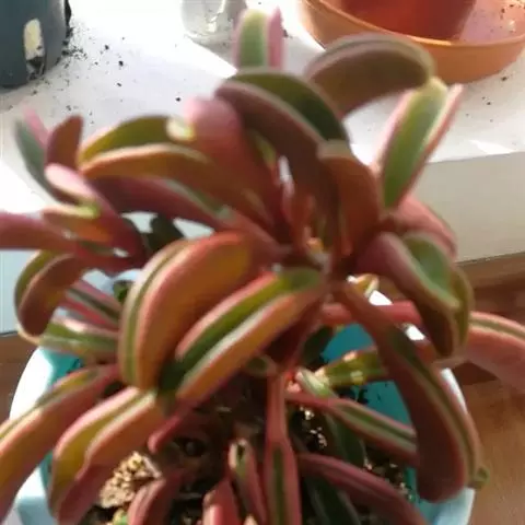 肥厚多肉的叶片椭圆形,对生或轮生,具短柄,叶片两边向上翻,使叶面中间形成一浅沟,背面呈龙骨状突起。叶面光亮,稍呈透明状。花序棒状,绿色,春夏季节开放。