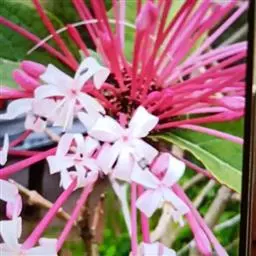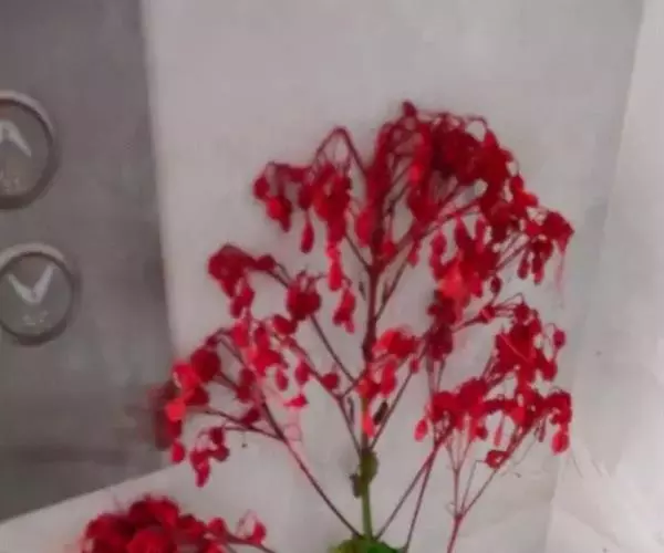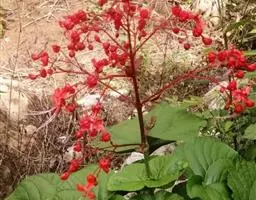 二歧聚伞花序组成顶生,大而开展的圆锥花序,长15-34厘米,宽13-35厘米,花序的最后侧枝呈总状花序,长可达16厘米,苞片宽卵形、卵状披针形、倒卵状披针形、线状披针形,有柄或无柄,小苞片线形;花萼红色,外面疏被短柔毛,散生盾形腺体,长1-1.5厘米,深5裂,裂片卵形或卵状披针形,渐尖,长0.7-1.3厘米,开展,外面有1-3条细脉,脉上具短柔毛,内面无毛,有疏珠状腺点;花冠红色,稀白色,花冠管长1.7-2.2厘米,外面具微毛,里面无毛,顶端5裂,裂片长圆形,开展,长1-1.5厘米;雄蕊长约达花冠管的3倍;子房无毛,4室,柱头2浅裂,与雄蕊均长突出于花冠外。果实椭圆状球形,绿色或蓝黑色,径7-10毫米,常分裂成2-4个分核,宿萼增大,初包被果实,后向外反折呈星状。花果期5-11月。