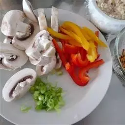 把材料切成丝和丁,倒些油进锅炸腐竹片(炸腐竹片时油要热,但是要离火炸,不然会焦),之后把炸腐竹剩的油里倒进辣椒粉,制成辣椒油(注意用炸腐竹的余温就可以了,不用加火)。