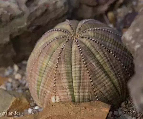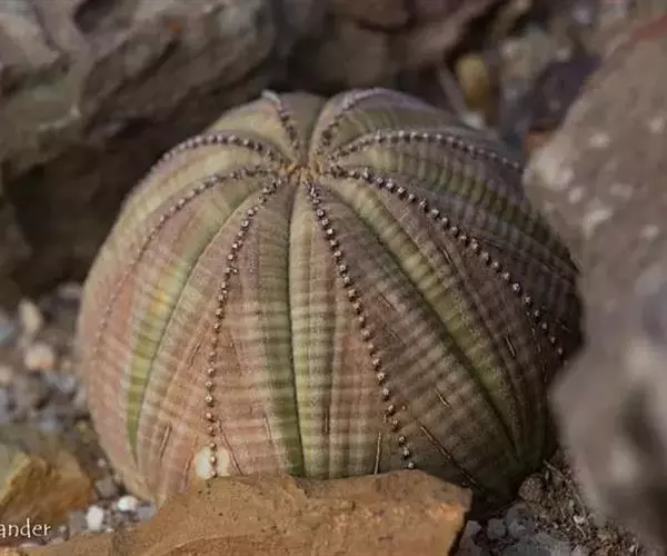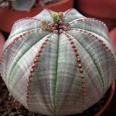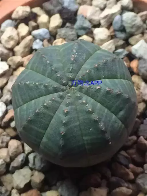 布纹球 ,又名晃玉、奥贝莎,属于大戟科大戟属植物。原产南非开普省。植株小球形,直径8—12厘米。具棱8,整齐。表皮灰绿色中有红褐色纵横交错的条纹,顶部条纹较密。棱缘上有褐色小钝齿。