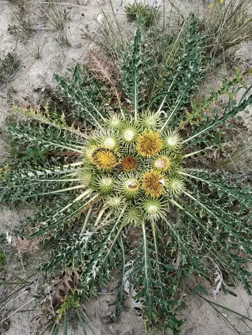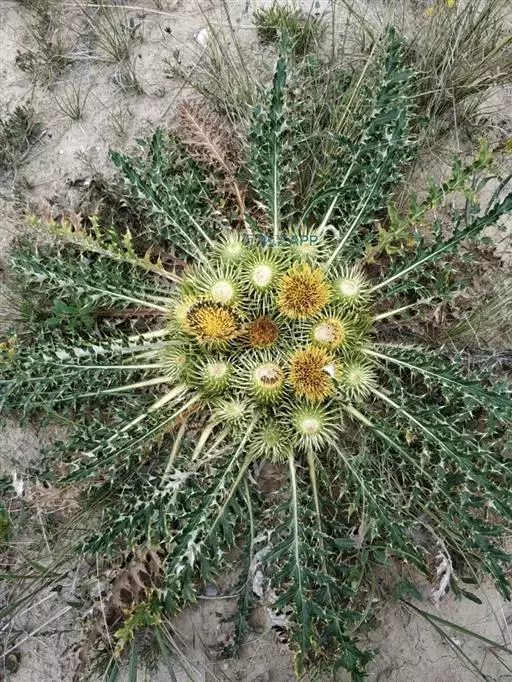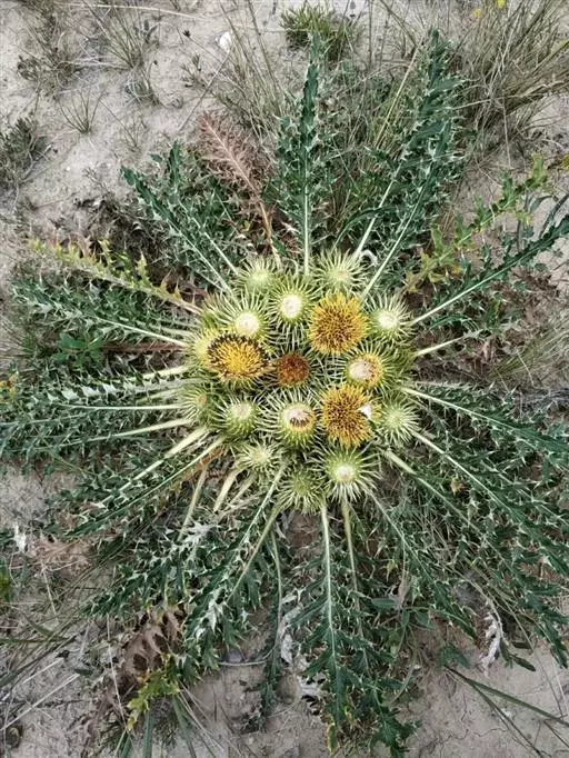 葵花大蓟,又名聚头蓟。多年生铺散草本。主根粗壮,直伸,生多数须根。茎基粗厚,无主茎,顶生多数或少数头状花序,外围以多数密集排列的莲座状叶丛。全部叶基生,莲座状,长椭圆形、椭圆状披针形或倒披针形,羽状浅裂、半裂、深裂至几全裂,长8-21厘米,宽2-6厘米,有长1.5-4厘米的叶柄,两面同色,绿色,下面色淡,沿脉有多细胞长节毛;侧裂片7-11对,中部侧裂片较大,向上向下的侧裂片渐小,有时基部侧裂片为针刺状,除基部侧裂片为针刺状的以外,全部侧片卵状披针形、偏斜卵状披针形、半椭圆形或宽三角形,边缘有针刺或大小不等的三角形刺齿而齿顶有针刺,全部针刺长2-5毫米。花序梗上的叶小,苞叶状,边缘针刺或浅刺齿裂。头状花序多数或少数集生于茎基顶端的莲座状叶丛中,花序梗极短(长5-8毫米)或几无花序梗。总苞宽钟状,无毛。总苞片3-5层,镊合状排列,或至少不呈明显的覆瓦状排列,近等长,中外层长三角状披针形或钻状披针形,包括顶端针刺长1.8-2.3厘米,不包括边缘针刺宽1-2毫米;内层及最内层披针形,长达2.5厘米,顶端渐尖成长达5毫米的针刺或膜质渐尖而无针刺,全部苞片边缘有针刺,针刺斜升或贴伏,长2-3毫米,或最内层边缘有刺痕而不形成明显的针刺。小花紫红色,花冠长2.1厘米,檐部长8毫米,不等5浅裂,细管部长1.3厘米。瘦果浅黑色,长椭圆状倒圆锥形,稍压扁,长5毫米,宽2毫米,顶端截形。冠毛白色或污白色或稍带浅褐色;冠毛刚毛多层,基部连合成环,整体脱落,向顶端渐细,长羽毛状,长达2厘米。花果期7-9月。