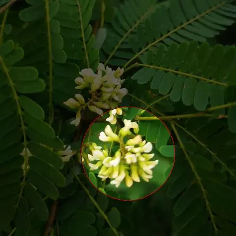 总状花序远较复叶短,幼时包藏于舟状、覆瓦状排列、早落的苞片内,数个总状花序常再集成腋生短圆锥花序;花梗长1-2毫米,与花萼和小苞片同被褐色短茸毛;基生小苞片卵形,副萼状小苞片披针形,均早落;花萼阔钟状,长约3毫米,萼齿短,阔三角形,除最下1枚先端急尖外,其余的均钝或圆,具缘毛;花冠绿白色,芳香,长约6毫米,各瓣均具长柄,旗瓣椭圆形,基部两侧稍呈截形,具耳,中间渐狭下延而成一瓣柄,翼瓣与龙骨瓣长圆形;雄蕊9,单体,有时10枚,其中1枚对着旗瓣;子房线形,除腹缝略具缘毛外,其余无毛,具短的子房柄,花柱稍长,柱头小。