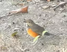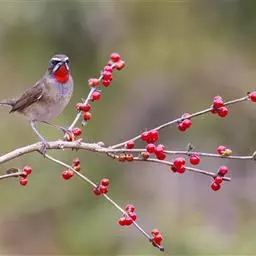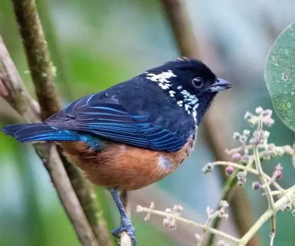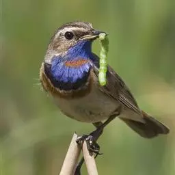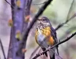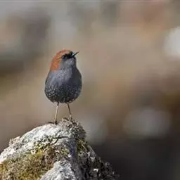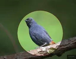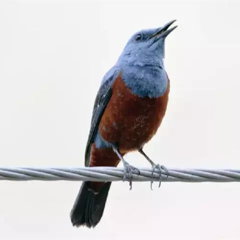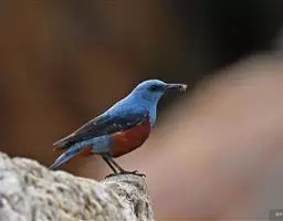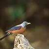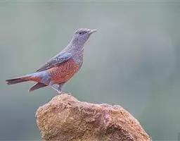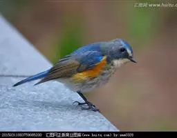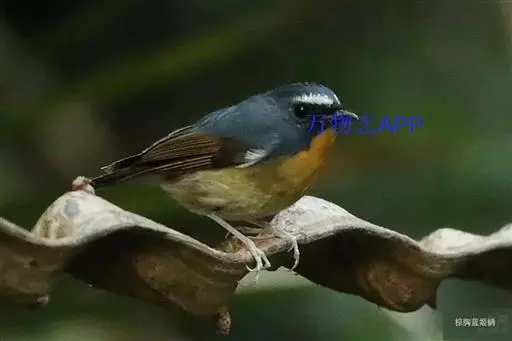 栗腹歌鸲(图2) 雄鸟:体小的深色歌鸲(15厘米),上体青石蓝色;眉纹白,喉、胸及两胁栗色;眼先及脸颊黑;腹中心及尾下覆羽白色。雌鸟:上体橄榄褐色,下体偏白,胸及两胁沾赭黄。幼鸟深褐色而具皮黄色点斑。虹膜-褐色;嘴-夏季黑色,冬季上嘴褐色,下嘴近粉;脚-粉褐。