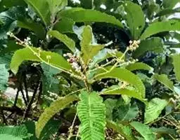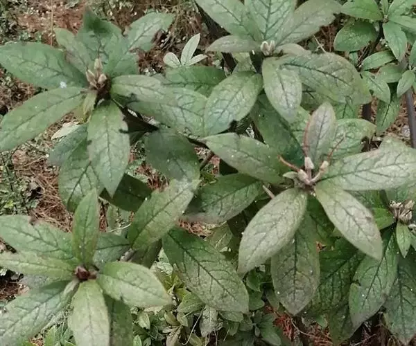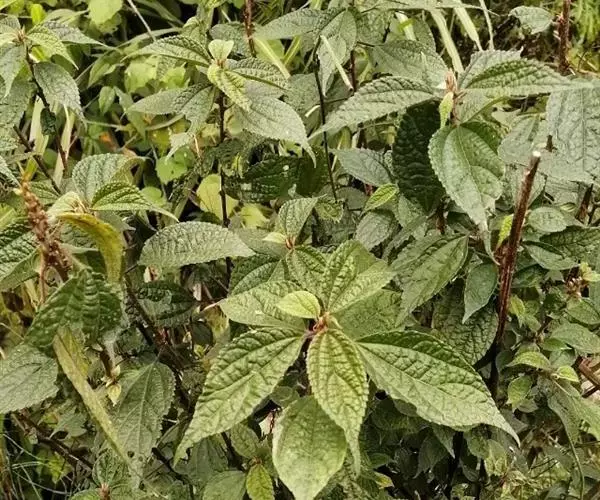 常绿灌木,高2-3米;小枝对生。叶革质,卵状椭圆形或长圆状椭圆形,长7-18厘米,宽4-10厘米,干时变棕黑色,叶面光亮,具黄色斑纹,侧脉扁平或微凹,背面光滑无毛,边缘在中部以上具5-7对牙齿;叶柄长2-4厘米,腹部具沟,无毛。圆锥花序顶生;雄花序长10-14厘米;雌花序为短圆锥花序;花瓣紫红色或暗紫色,近于卵形或椭圆状披针形,背部无毛,顶端尖尾状;雄花花萼杯状,顶端全缘;雄蕊短,长仅1毫米;花下面具1枚小苞片;雌花子房疏被柔毛,柱头偏斜;花下具2枚小苞片。浆果长卵圆形,成熟时暗紫色或黑色,长1.5-2厘米,直径8-10毫米;果柄长3-4毫米。