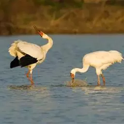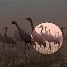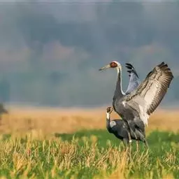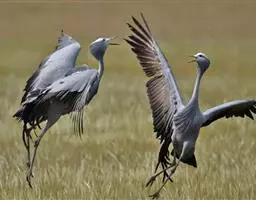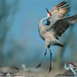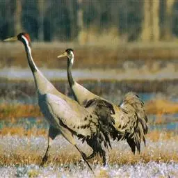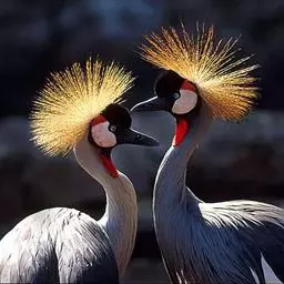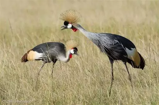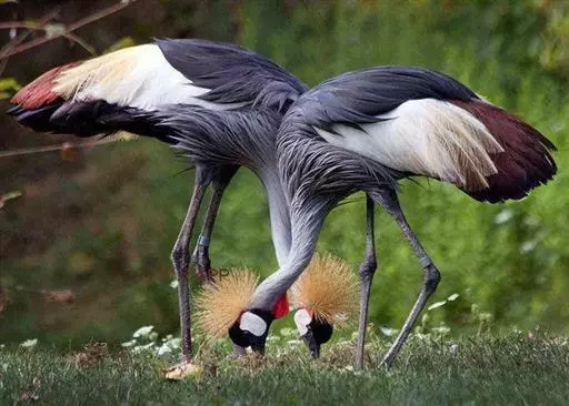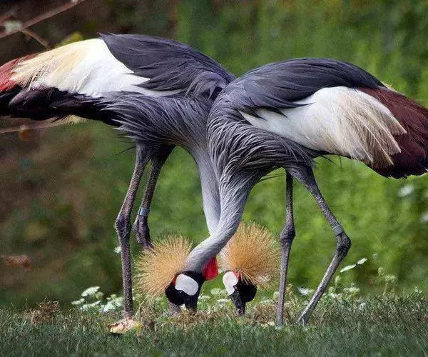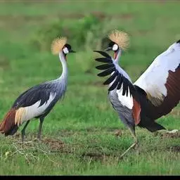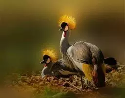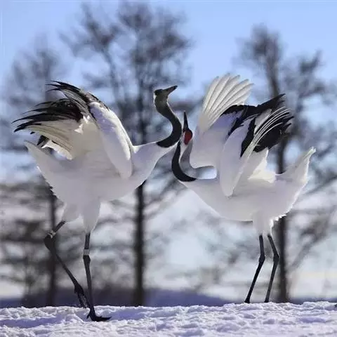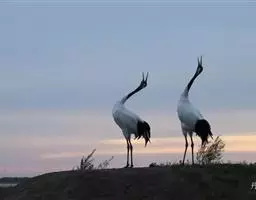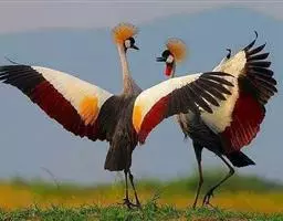 到了繁殖的季节,天性“喜歌善舞”的东非冕鹤经常成双结对地跳起优美的舞蹈。它们先是相互躬身颌首,以表相邀之意,然后双翅微展,企足延颈,跳将起来。舞步起始轻盈,渐趋急骤,最后竟如醉似痴。东非冕鹤喜欢鸣叫,“哦啊!哦啊!”的声音轻柔舒缓,清脆动人,或抒发自己的欢愉,或表达相互的情爱,特别是在子夜和黎明时分,声闻遐迩。所以,当地的农家、牧民都把它们同司晨的公鸡一样对待,当作一种时感很强的生物钟。