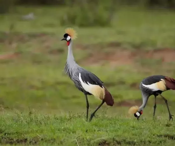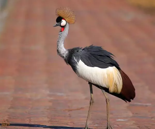 东非冕鹤也叫灰冠鹤,体长110厘米,翼展180-200厘米,体重3000-4000克。 具有瘦长挺立的双腿,伸展自如的长颈,优美动人的体态,大有超凡脱俗之气概。它的雄鸟与雌鸟的羽色非常相似,全身的羽毛都呈深浅不同的灰色,飞羽为白色,翼尖和尾羽为棕褐色,光华熠熠。但最为楚楚动人之处,还是它的头部,清癯的双颊上嵌着上面是小块红色,下面为大块白色的斑块,以及一对炯炯有神的小圆眼睛,喉下悬垂着两个红色的大肉垂。头顶前部的羽毛象覆盖着一块乌黑的绒缎,柔软光洁,后部则佩戴着一顶挺硬的丝毛织成的锦冠,金光闪耀,就象皇冠一样美丽。