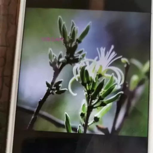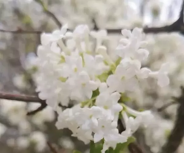 圆锥花序生于能生幼叶的短枝之顶,长3-5厘米,有多数花,幼时略被细短毛,后变无毛,花先叶开放,芳香;苞片条状披针形,具缘毛;萼筒筒状倒圆锥形,长约2毫米,萼齿卵形,长约0.5毫米,顶钝;花冠蕾时粉红色,开后变白色,高脚碟状,直径约1厘米,筒长7-10毫米,上部略扩张,裂片5(-4)枚,长约4毫米,宽约3毫米,开展;雄蕊生于花冠筒内中部以上,着生点不等高,花丝极短或不存在,花药黄白色,近圆形;柱头3裂,不高出萼齿。