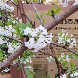 香荚蒾(学名:Viburnum farreri W. T. Stearn)是忍冬科、荚蒾属落叶灌木,高可达5米;冬芽椭圆形,顶尖,叶片纸质,顶端锐尖,基部楔形至宽楔形,边缘基部除外具三角形锯齿,下面脉上被微毛,下面凸起,小脉不明显或两面略凹陷;圆锥花序生于能生幼叶的短枝之顶,有多数花,花先叶开放,芳香;苞片条状披针形,萼齿卵形,花冠蕾时粉红色,开后变白色,花丝极短或不存在,花药黄白色,近圆形;果实紫红色,4-5月开花。