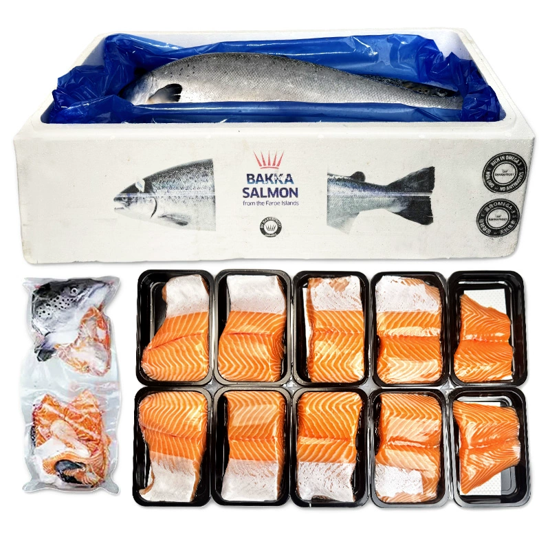 三文鱼体侧扁,背部隆起,齿尖锐,鳞片细小,银灰色,产卵期有橙色条纹。鲑鱼肉质紧密鲜美,肉色为粉红色并具有弹性。