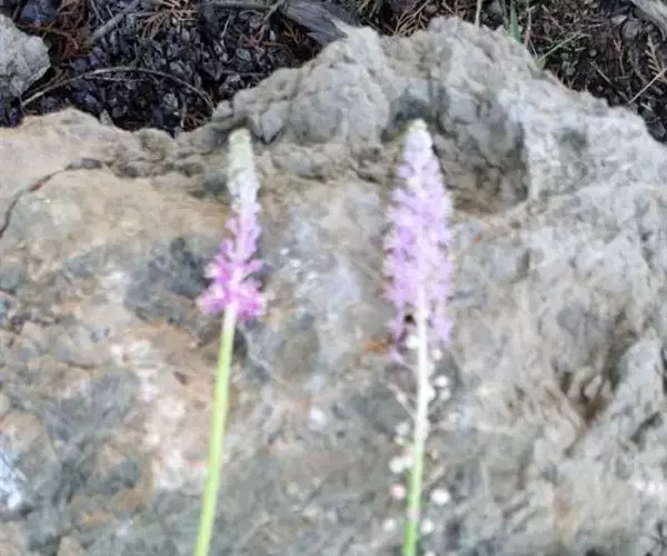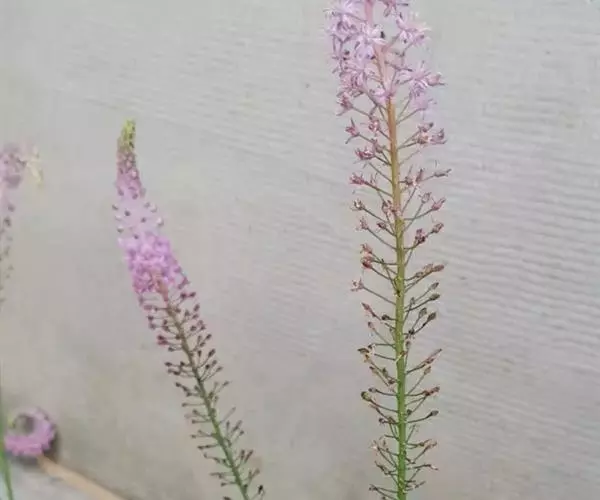 花葶通常比叶长;总状花序长2-20厘米,具多数花;花紫红色、粉红色至白色,小,直径约4-5毫米,在花梗顶端脱落;花梗长5-12毫米,基部有1-2枚较小的、狭披针形苞片;花被片近椭圆形、倒卵形或狭椭圆形,长2.5-4毫米,宽约1.2毫米,基部稍合生而成盘状,先端钝而且增厚;雄蕊生于花被片基部,稍短于花被片;花丝近披针形,边缘和背面常多少具小乳突,基部稍合生,中部以上骤然变窄,变窄部分长约1毫米;子房长1.5-2毫米,基部有短柄,表面多少有小乳突,3室,每室1个胚珠;花柱长约为子房的一半至2/3。