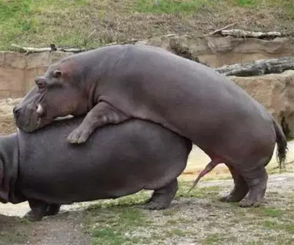 雌河马一般会单独带着小河马生活两个月,安静地享受着天伦之乐。母子俩常常静静地躺着休息,小河马紧紧地依偎在母亲的嘴边。有时,母亲又想带它下水去,因为河马总是摆脱不了如何稳定体温的问题,岸上呆久了,就要下水去降降温,这时小河马便很熟练地爬上母亲的背或脖子下水。小河马还需不停地吃奶,雌河马身子横卧,把一只后腿伸开去,乳房便露了出来,小河吃奶时,母河马会用另一只后腿托住乳房不停地按摩,以刺激奶水。蚊子会不时地飞来,这些家伙对流散的乳汁很喜欢,有时就歇在乳头周围,母河马于是就用大嘴使劲地拍击着河水,以此惊走到处乱飞的蚊子。小河马可以自己上岸了,母河马便不再溺爱它,让它自己潜水,小河马难免会在爬上岸时摔倒,母河马就用嘴去扶住它,鼓励它自己爬起来。母河马也不纵容小河马顽皮的游戏,会用巨大的身躯来阻挡它,或者干脆用大嘴巴来“教训”它。