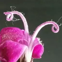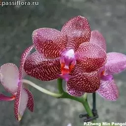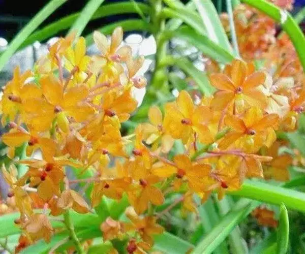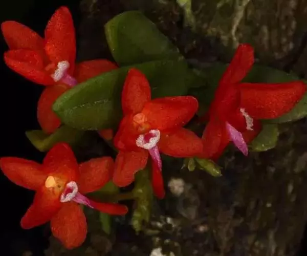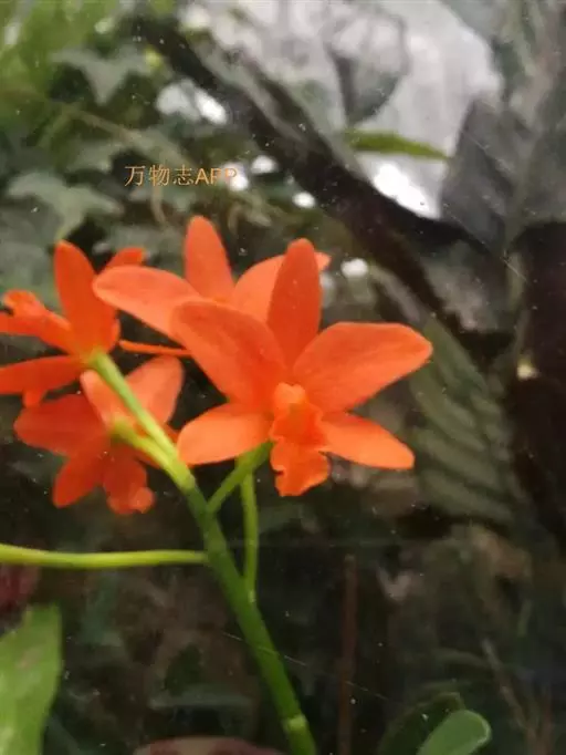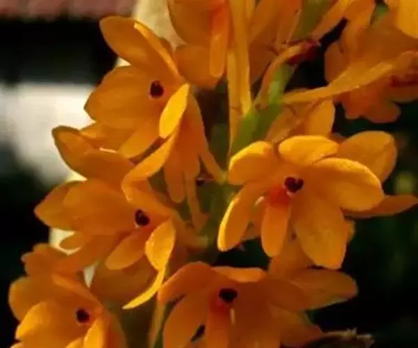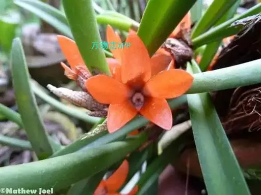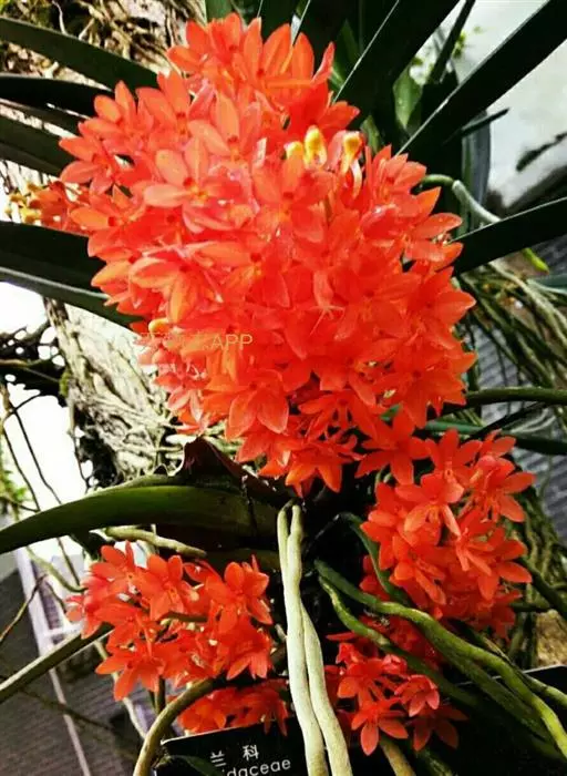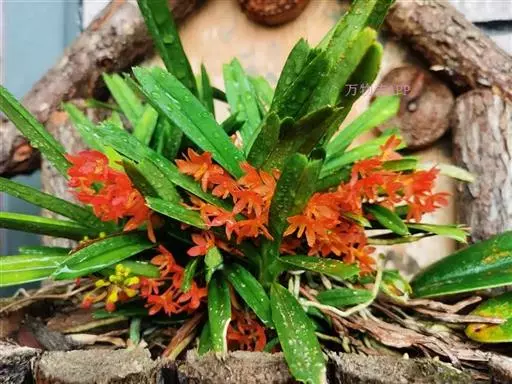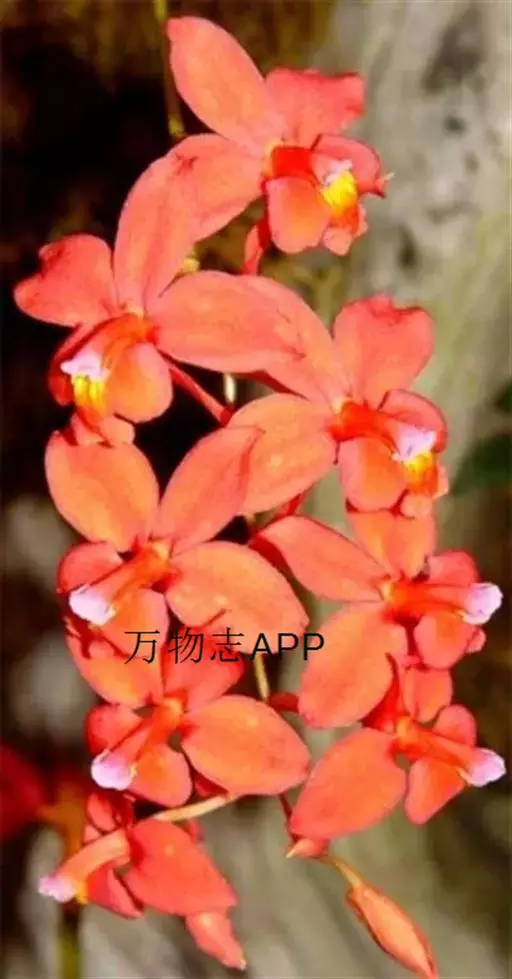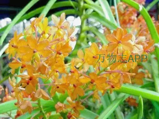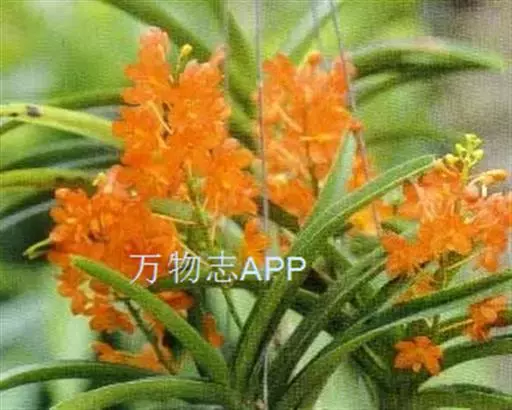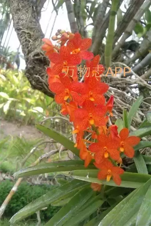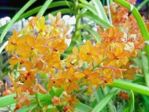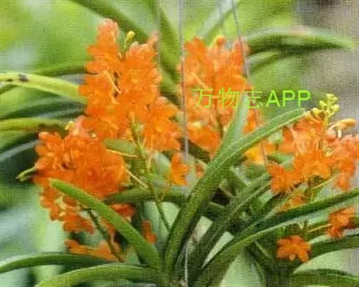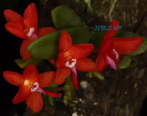 鸟舌兰(学名:Ascocentrum ampullaceum (Roxb.) Schltr.):植株高约10厘米。茎直立,粗壮,长1-4厘米,被叶鞘所包。叶厚革质,扁平,下部常V字形对折,上部稍向外弯,上面黄绿色带紫红色斑点,背面淡红色。总状花序密生多数花;花苞片很小,卵状三角形,长约1毫米,先端急尖;唇瓣3裂;侧裂片黄色,很小,直立,近三角形,先端稍钝,前侧边缘内折;药帽紫褐色,前端稍收狭,先端钝并且翘起;花粉团茄紫色,具狭扁而曲膝状的柄和近椭圆形的粘盘。花期4-5月。