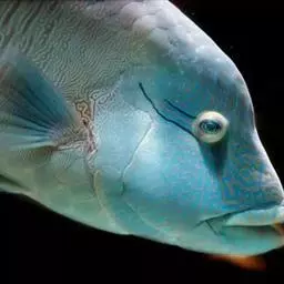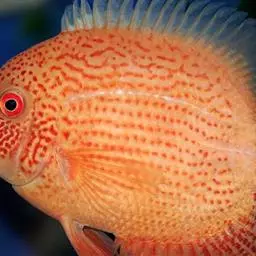 额斑刺蝶鱼,体卵圆形侧扁,有鲜明蓝色轮廓和数条鲜蓝竖纹,全身密布网格状具蓝色边缘的珠状黄点,深蓝色…