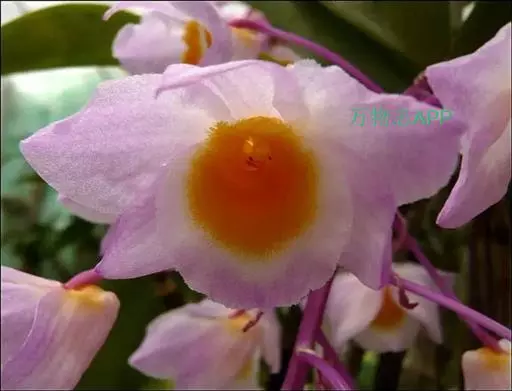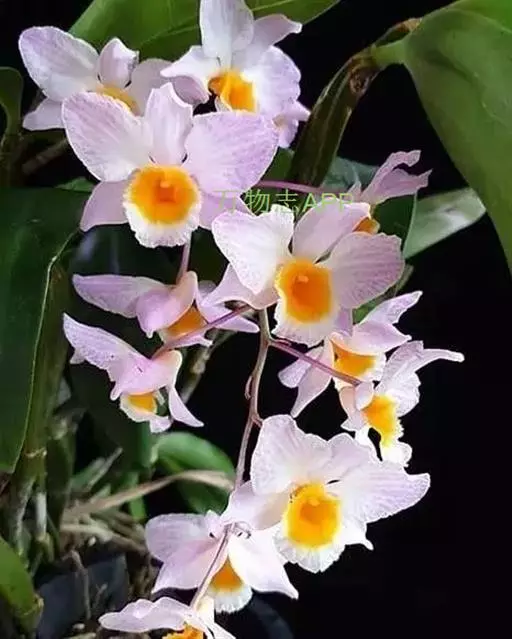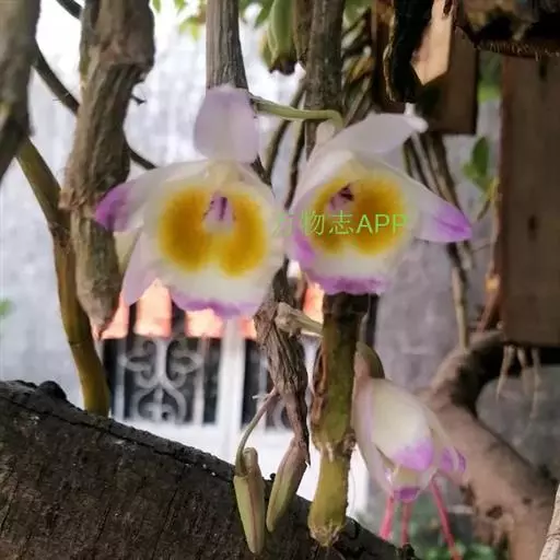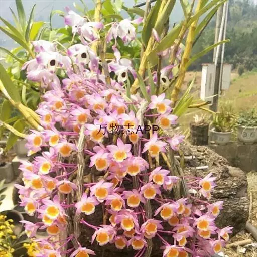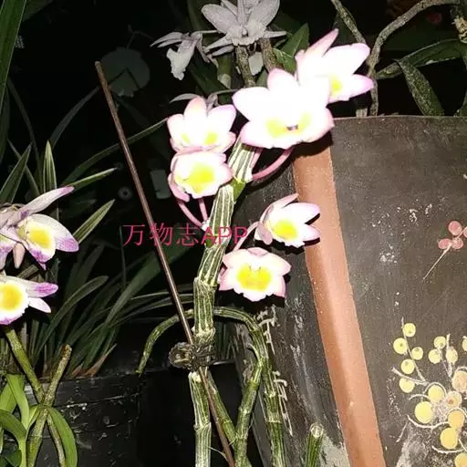 玫瑰石斛(学名:Dendrobium crepidatum Lindl. ex Paxt.):茎悬垂,肉质状肥厚,青绿色,圆柱形,不分枝,具多节,节间长3-4厘米。叶近革质,狭披针形。总状花序很短,从落了叶的老茎上部发出,具1-4朵花;花质地厚,开展;萼片和花瓣白色,中上部淡紫色,干后蜡质状;花瓣宽倒卵形,长2.1厘米,宽1.2厘米,先端近圆形,具5条脉;唇瓣中部以上淡紫红色,中部以下金黄色,近圆形或宽倒卵形。花期3-4月。
