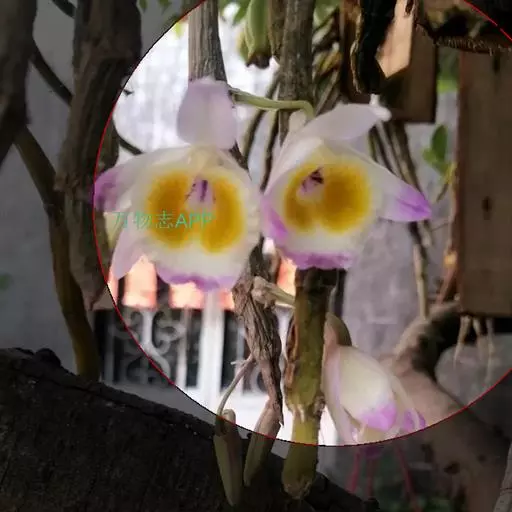 花瓣宽倒卵形,长2.1厘米,宽1.2厘米,先端近圆形,具5条脉;唇瓣中部以上淡紫红色,中部以下金黄色,近圆形或宽倒卵形,长约等于宽,2厘米,中部以下两侧围抱蕊柱,上面密布短柔毛;蕊柱白色,前面具2条紫红色条纹,长约3毫米;药帽近圆锥形,顶端收狭而向前弯,前端边缘具细齿。花期3-4月。