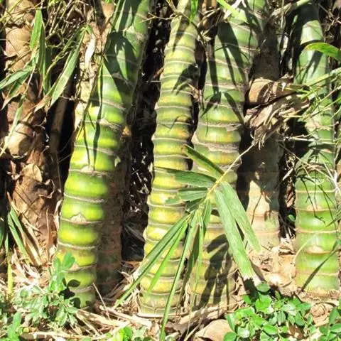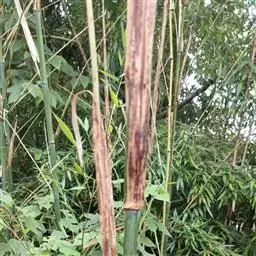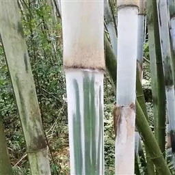 乔木状竹类,地下茎合轴型。 竿直立,顶端微弯曲,高(3)5-10(18)米,直径3-5(7)厘米;节间幼时被白色蜡粉,无毛,一般长30-45厘米,惟最长者可达1米或更长,竿壁厚3-5毫米;竿环平坦;箨环稍隆起,最初在节下方密生一圈向下的棕色刺毛环,以后则渐变无毛。