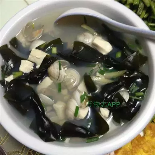 海带(鲜):海带含碘量极高,是体内合成甲状腺素的主要原料,常食可令秀发润泽乌黑。海带具有一定的药用价值,因为海带中含有大量的碘,碘是甲状腺合成的主要物质,如果人体缺少碘,就会患“粗脖子病”,即甲状腺机能减退症,所以,海带是甲状腺机能低下者的最佳食品。海带中还含有大量的甘露醇,而甘露醇具有利尿消肿的作用,可防治肾功能衰竭、老年性水肿、药物中毒等。甘露醇与碘、钾、烟酸等协同作用,对防治动脉硬化、高血压、慢性气管炎、慢性肝炎、贫血、水肿等疾病,都有较好的效果。海带中的优质蛋白质和不饱和脂肪酸,对心脏病、糖尿病、高血压有一定的防治作用。中医认为,海带性味咸寒,具有软坚、散结、消炎、平喘、通行利水、祛脂降压等功效,并对防治矽肺病有较好的作用。海带胶质能促使体内的放射性物质随同大便排出体外,从而减少放射性物质在人体内的积聚,也减少了放射性疾病的发生几率。
