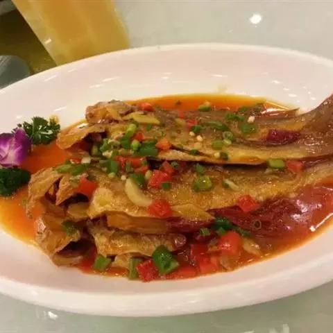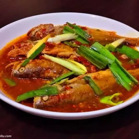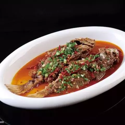 干烧小黄鱼 是由黄鱼等制作的食物,配料是葱、姜、蒜。