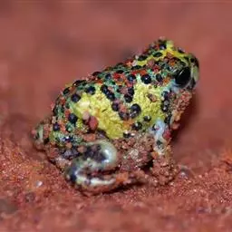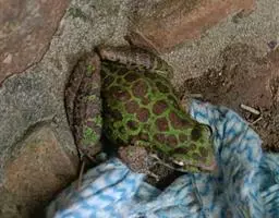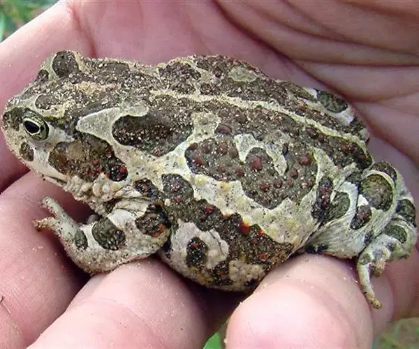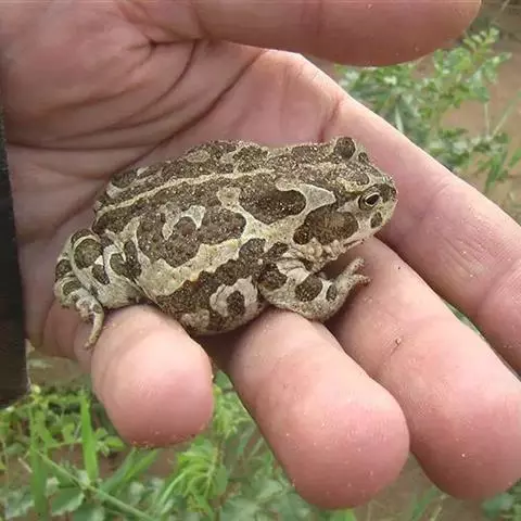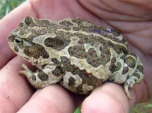 花背蟾蜍,两栖纲,蟾蜍科。体长6-7cm。雄蟾蜍背面橄榄黄色,皮肤粗糙,密布大小瘰疣,上有许多小白刺。雌蟾蜍背面浅绿色,有深褐色或酱黑色花斑,瘰疣稀疏,皮肤较光滑。腹面乳白色,满布扁平小疣。口后有大疣。耳后腺大而扁平。雄性皮肤粗糙,头部、上眼睑及背面密布不等大的疣粒,雌性疣粒较少,耳后腺大而扁;四肢及腹部较平滑。