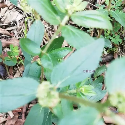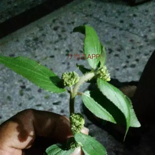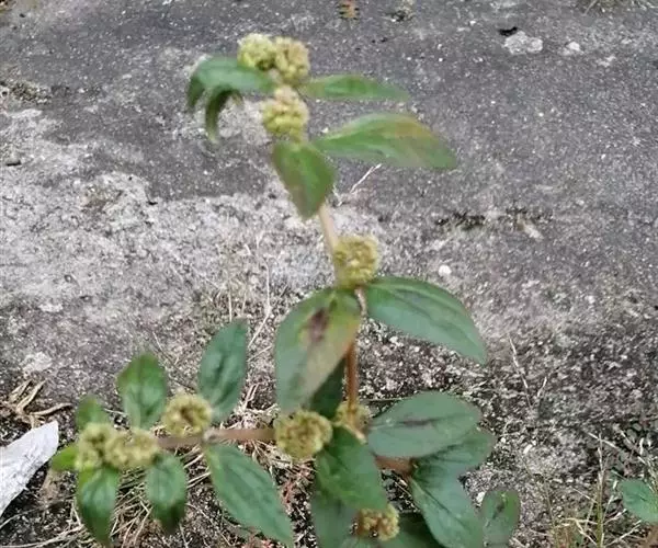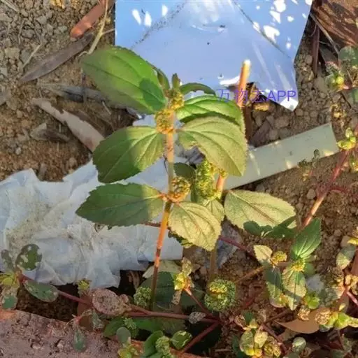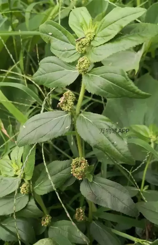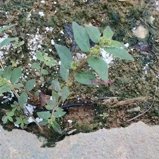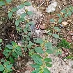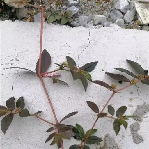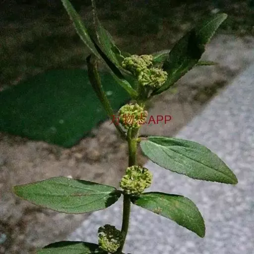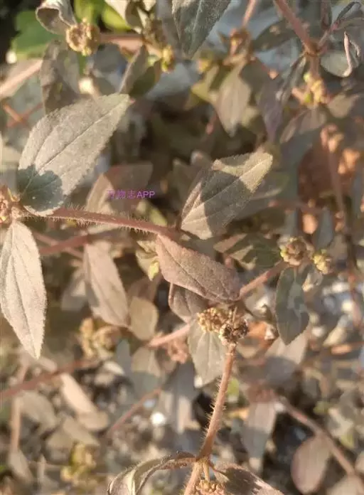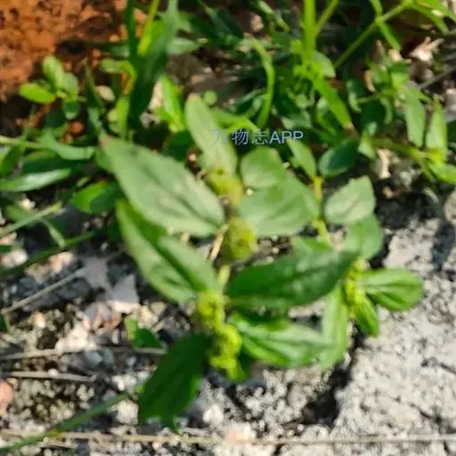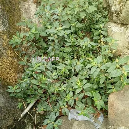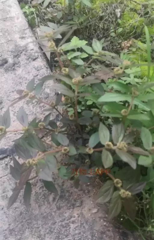 飞扬草 一年生草本。其茎呈近圆柱形,长15~1250px,直径l~3mm。表面黄褐色或浅棕红色;质脆,易折断,断面中空;地上部分被长粗毛。叶对生,皱缩,展平后叶片椭圆状卵形或略近菱形,长l~100px,宽0.5~32.5px;绿褐色,先端急尖或钝,基部偏斜,边缘有细锯齿,有3条较明显的叶脉。聚伞花序密集成头状,腋生。蒴果卵状三棱形。常生于向阳山坡、山谷、路旁或灌丛下。