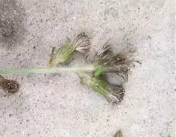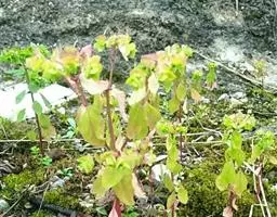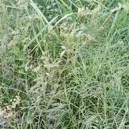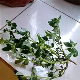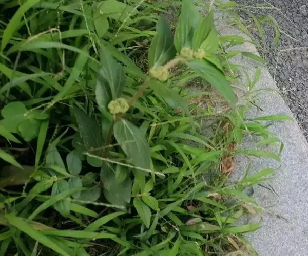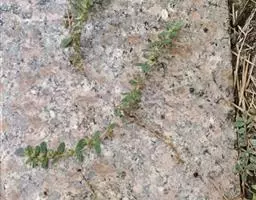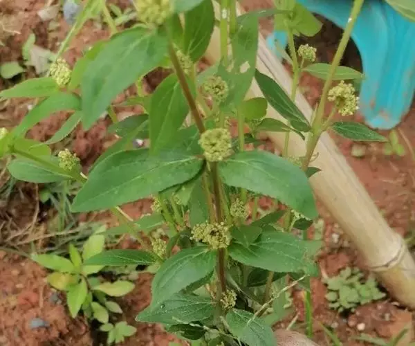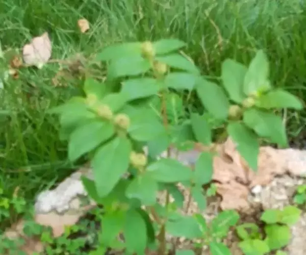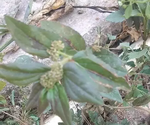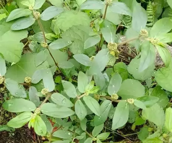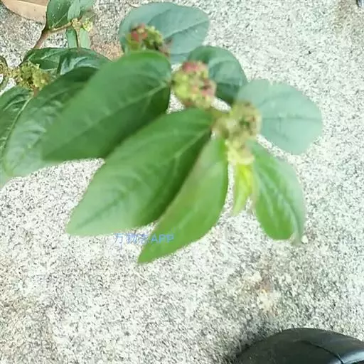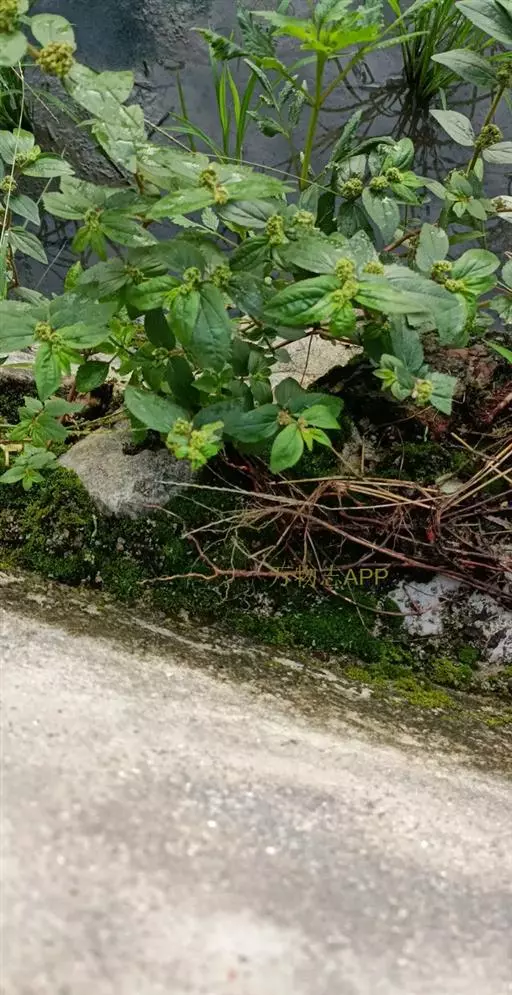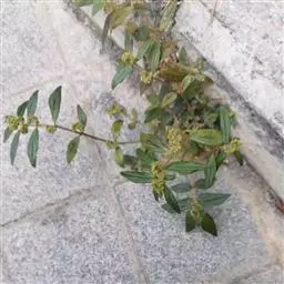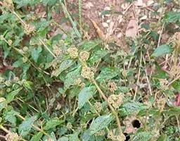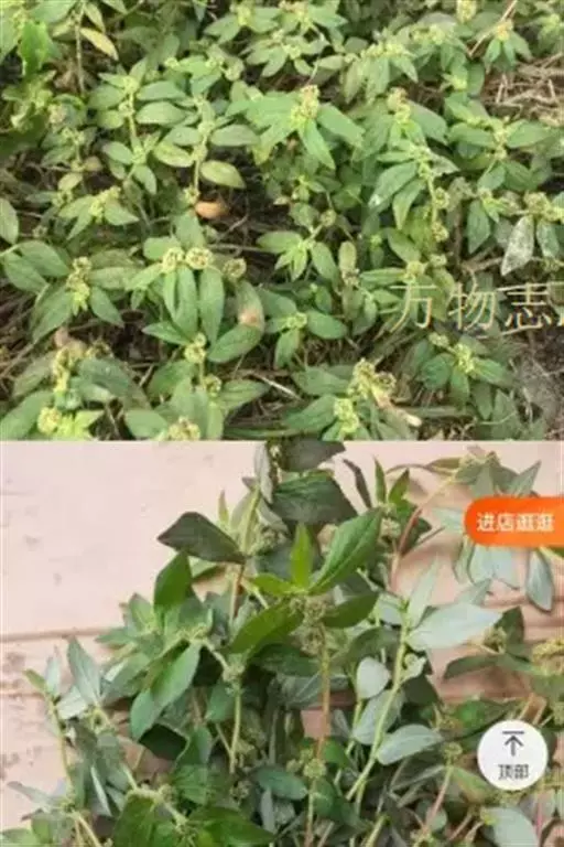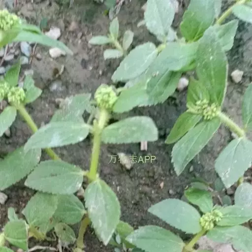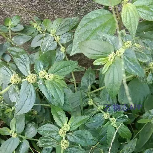 飞扬草 一年生草本。其茎呈近圆柱形,长15~1250px,直径l~3mm。表面黄褐色或浅棕红色;质脆,易折断,断面中空;地上部分被长粗毛。叶对生,皱缩,展平后叶片椭圆状卵形或略近菱形,长l~100px,宽0.5~32.5px;绿褐色,先端急尖或钝,基部偏斜,边缘有细锯齿,有3条较明显的叶脉。聚伞花序密集成头状,腋生。蒴果卵状三棱形。常生于向阳山坡、山谷、路旁或灌丛下。