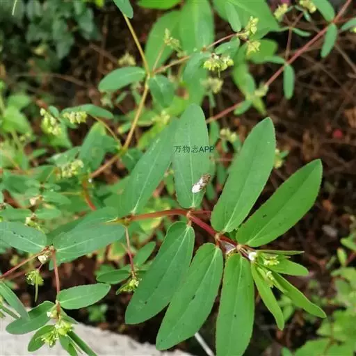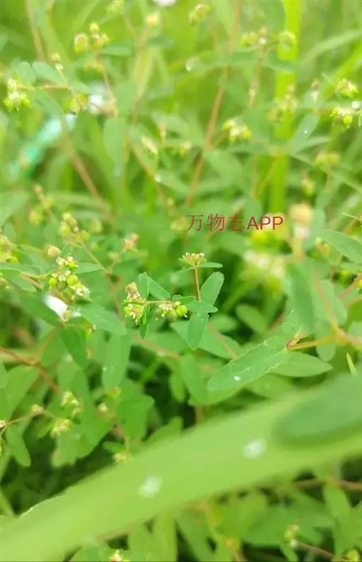 一年生草本,含白色乳汁。茎匍匐,多分枝,稍被毛,高不及15厘米,通常红色。叶对生,椭圆形至矩圆形,长4~6毫米,很少达8毫米,宽2~4毫米,先端钝,基部偏斜而截头状,边缘有极小的锯齿,上面深绿色,下面浅绿带灰白色;叶柄甚短;托叶细小,生于叶柄基侧。杯状花序单生或少数聚伞状排列于叶腋;几无柄;总苞陀螺状,淡紫色,长约1毫米;腺体4,漏斗状;花单性,无花被;雌雄花同生于总苞内;雄花多数,只具雄蕊1;雌花1,生于花序中央,子房3室,花柱2,离生且顶端2裂。蒴果有毛,卵状三棱形,长1.5毫米许。种子有纵沟纹5~6条。花期夏季。