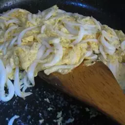 3 倒出炸油,留油1匙 ,放入虾米、蒜末、冬菜、姜末及绞肉,炒干。