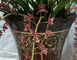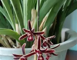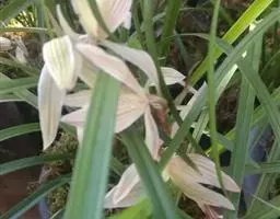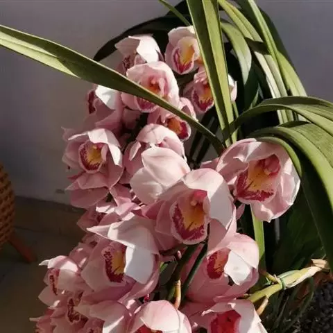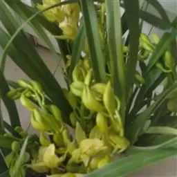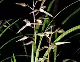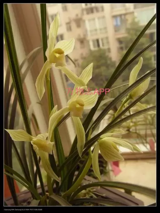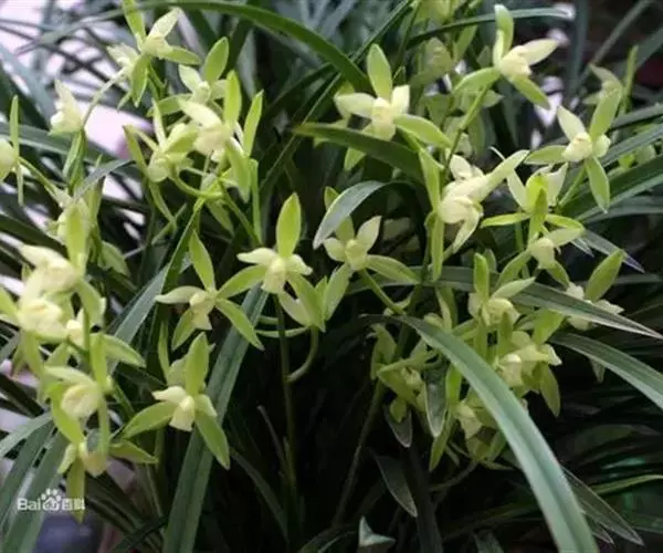 建兰素花,绿白色(接近纯白),清香,一枝开花5至12朵。叶色钢青,细而挺拔,有铮铮铁骨之相,所以叫铁骨素。在日本称其为天香,又得名天香素。花期7至11月份。