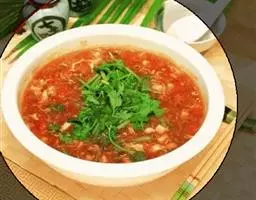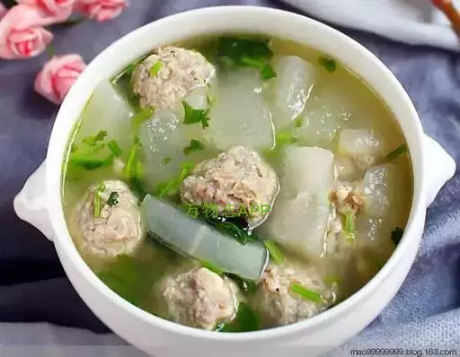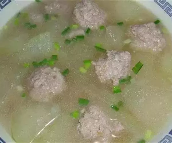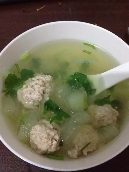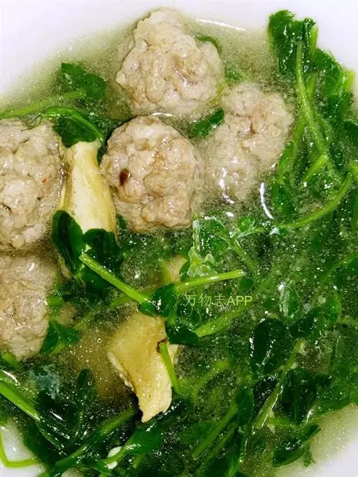 原料:精肉、生姜末、精盐、味精、香菜、香油。 丸子汤