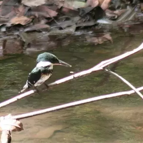 绿鱼狗是佛法僧目翠鸟科的鸟类。成年雄鸟,额头和眼先是黑色,头顶端深绿色呈古铜光泽。翅膀羽毛有白色斑…