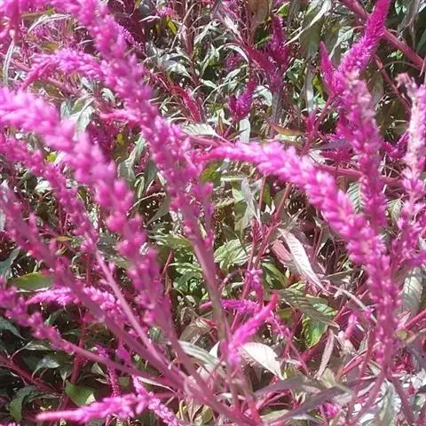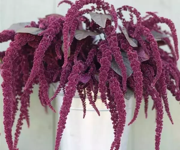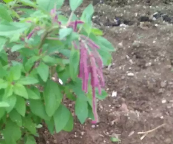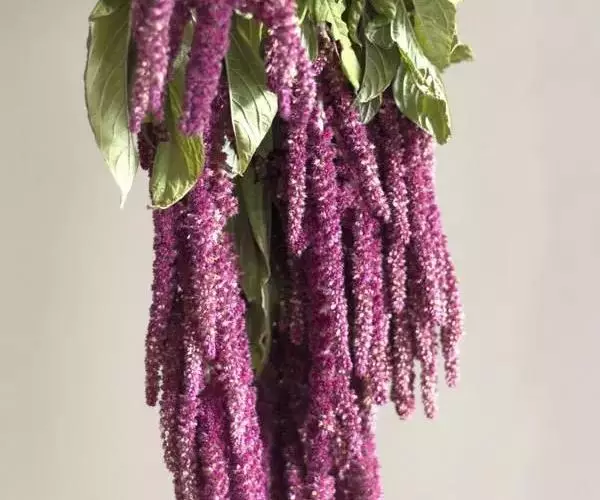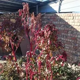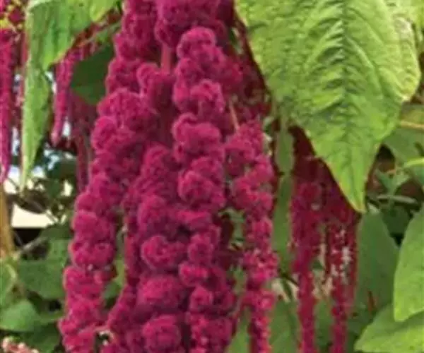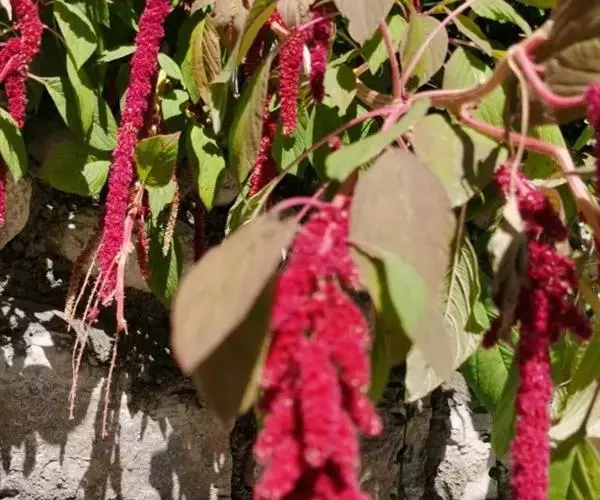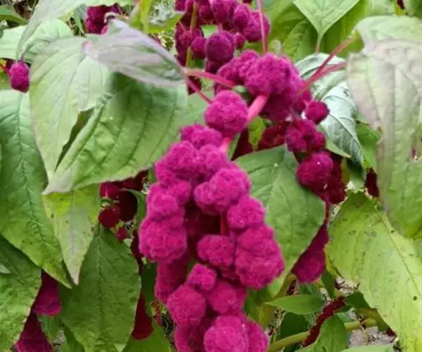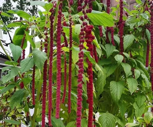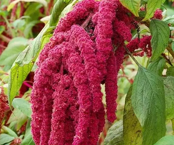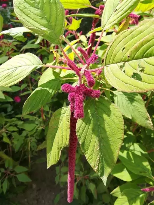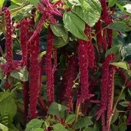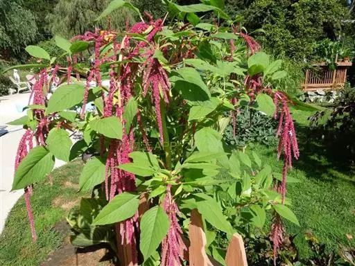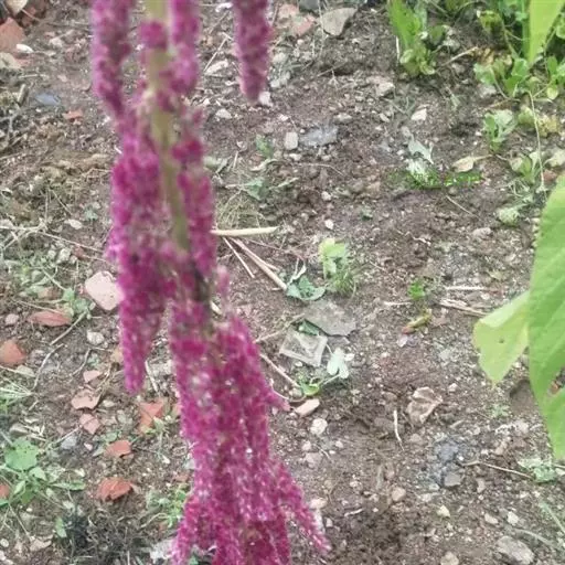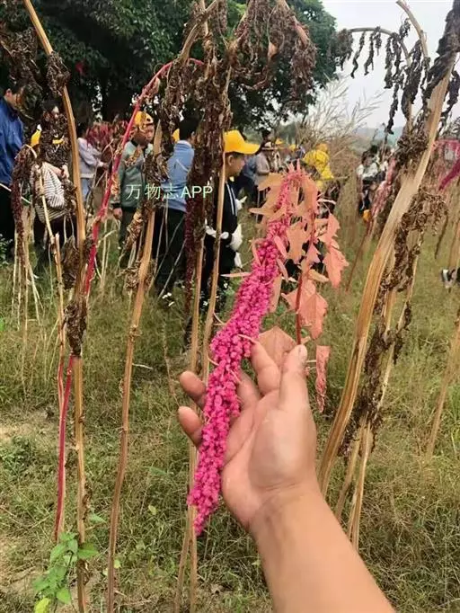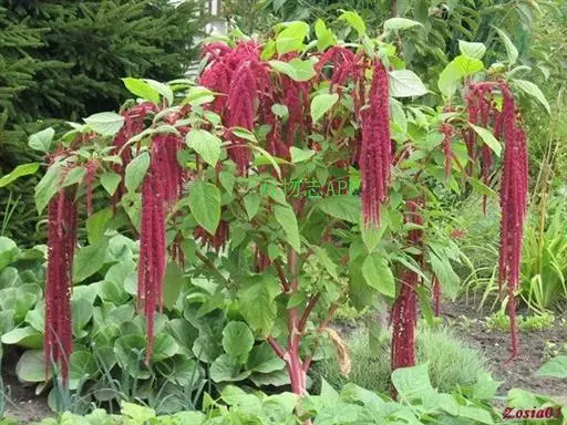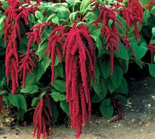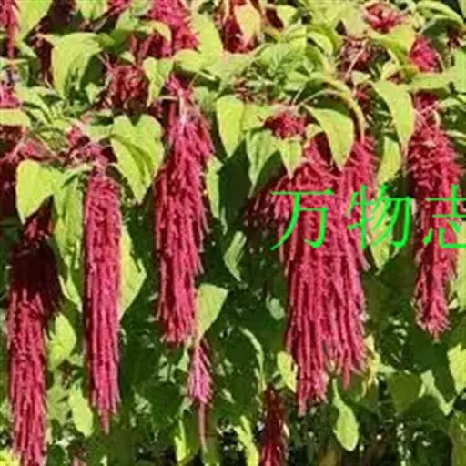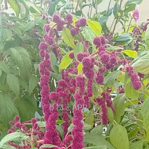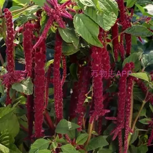尾穗苋(Amaranthus caudatus L.)苋科一年生草本,高达1.5米;茎直立,粗壮,具钝棱角,单一或稍分枝,绿色,或常带粉红色,幼时有短柔毛,后渐脱落。叶片菱状卵形或菱状披针形,顶端短渐尖或圆钝,具凸尖,基部宽楔形,稍不对称,全缘或波状缘,绿色或红色,除在叶脉上稍有柔毛外,两面无毛;胞果近球形,直径3毫米,上半部红色,超出花被片。种子近球形,直径1毫米,淡棕黄色,有厚的环。花期7-8月,果期9-10月。