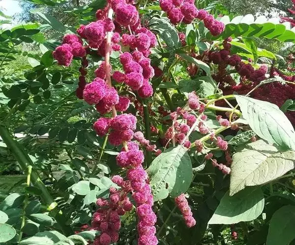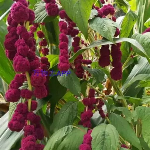 一年生草本,高达15米;茎直立,粗壮,具钝棱角,单一或稍分枝,绿色,或常带粉红色,幼时有短柔毛,后渐脱落。叶片菱状卵形或菱状披针形,长4-15厘米,宽2-8厘米,顶端短渐尖或圆钝,具凸尖,基部宽楔形,稍不对称,全缘或波状缘,绿色或红色,除在叶脉上稍有柔毛外,两面无毛;叶柄长1-15厘米,绿色或粉 繁穗苋 红色,疏生柔毛。圆锥花序顶生,下垂,有多数分枝,中央分枝特长,由多数穗状花序形成,顶端钝,花密集成雌花和雄花混生的花簇;苞片及小苞片披针形,长3毫米,红色,透明,顶端尾尖,边缘有疏齿,背面有1中脉;花被片长2-2.5毫米,红色,透明,顶端具凸尖,边缘互压,有1中脉,雄花的花被片矩圆形,雌花的花被片矩圆状披针形;雄蕊稍超出;柱头3,长不及1毫米。胞果近球形,直径3毫米,上半部红色,超出花被片。种子近球形,直径1毫米,淡棕黄色,有厚的环。花期7-8月,果期9-10月。