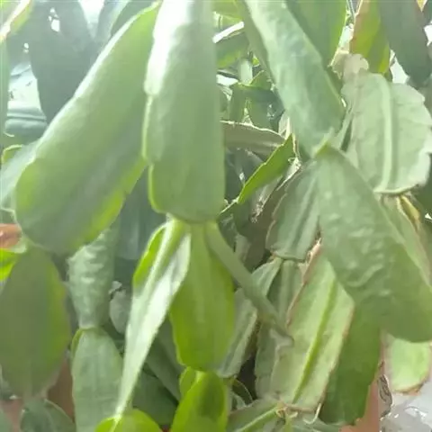 仙人指茎节(叶片)为扁平倒卵状,叶边缘无尖齿,呈浅波状。