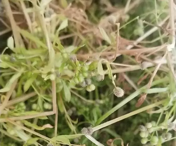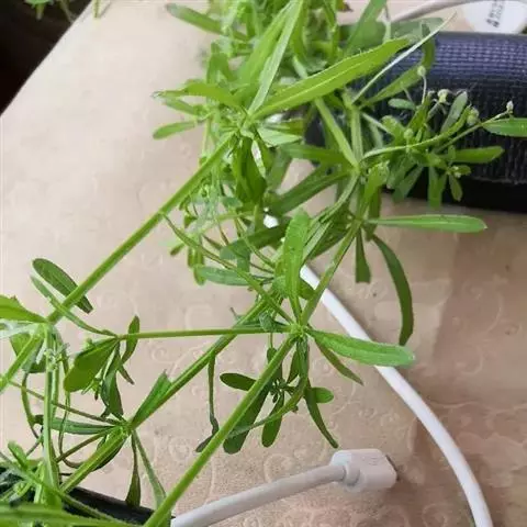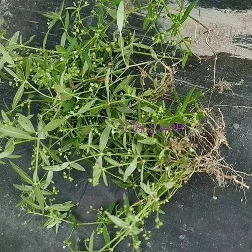 【药材识别】本品根细小。茎呈四棱柱形,多分枝,长20~30cm,直径约lmm, 猪殃殃 灰绿色或绿褐色,棱上有侧生剌毛;质脆,易折断,断面中空。叶6~8片轮生,无柄,叶片多卷缩或破碎,完整者线状披针形或近倒披针形,长1~5.5cm,宽0.2~1cm,边缘及下面中脉有倒生刺毛。聚伞花序腋生或顶生,花小,易脱落。果小,由2个球形分果片组成,绿褐色,密生白色钩毛。气微,味淡。