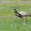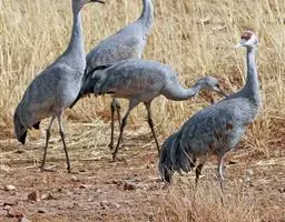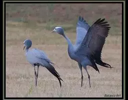 蓑羽鹤大型涉禽,体长68~92厘米,是鹤类中个体最小者。通体蓝灰色,眼先、头侧、喉和前颈黑色,…