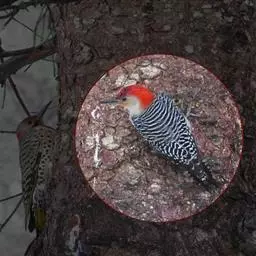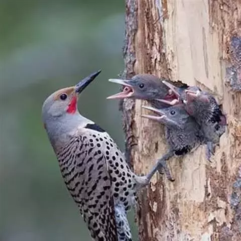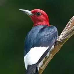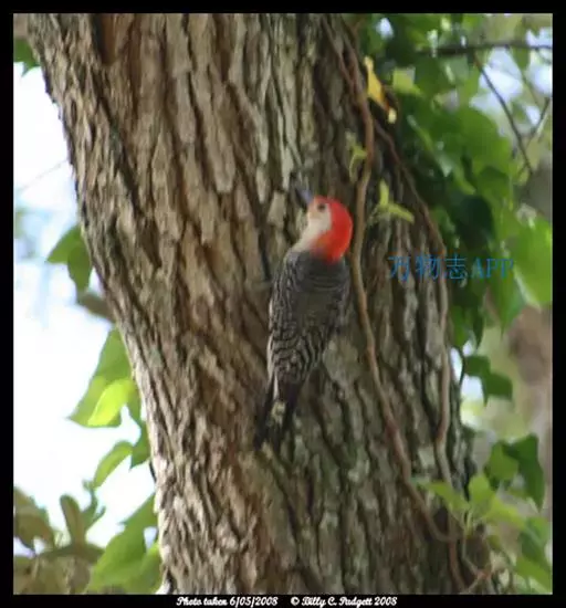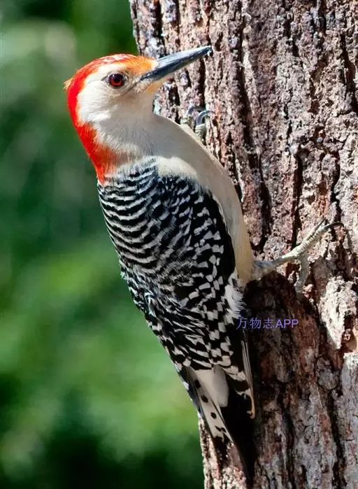 红腹啄木鸟(学名:Melanerpes carolinus)成年雄鸟头项有红帽,翅膀和上体是黑白相间的斑纹状羽毛,腹部有一片红羽毛。头亦大,但颈较长,嘴强硬而直,呈凿形,鼻孔裸露;尾羽羽干大都硬挺且尖,尾羽12片,初级飞羽9片。头骨为蜥腭型,锄骨被一些成对的骨片所代替,颌腭骨细小远离两侧,胸骨后端每侧有2切刻,胸骨柄分叉。腿肌肉缺栖肌和副股尾肌;角舌骨延成环带状,两侧自咽喉绕过枕部至上嘴基。生活于湿地生境,枯在树木,低地沼泽森林,也出没于茂密的森林,河流沿岸。分布于北美洲。