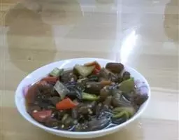 4、取一点油,烧开,放入姜丝爆香,然后放入肉段,胡萝卜丁,黄瓜丁,再放入调料,还有番茄酱。翻炒一会就可以出锅了。