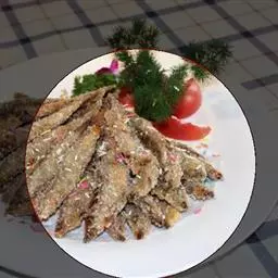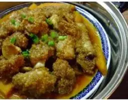 2、然后放入油,加热到冒气,往里放入挂完浆的肉段。炸至金黄色,捞出。