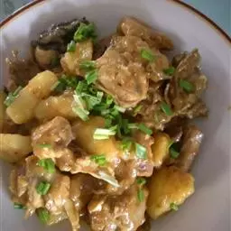 2、烧热锅放水1公斤,并加入肉块和葱姜块,用小火炖至八成烂,倒入漏勺,沥去水分,待用。