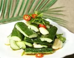 3、炒锅置旺火上烧热,舀入花生油,放入豌豆苗、精盐、味精,煸炒至翠绿色,起锅盛放在肉块两端即成。
