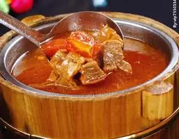 4、原炒锅烧热,放入芝麻油,四成热时,放入番茄酱,待油炒至呈红色时,放入肉块,加入鸡汤、料酒、葱姜末、白糖、醋、盐、味精、樱桃汁,用小火煨15分钟,再用旺火至汤汁浓厚,出锅,装盆。