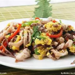 美它:“色绕佩珠明”,杜牧夸奖它:“圆疑窃龙颔”。所以晶莹的樱桃肉在盘底绿色蔬叶的衬托下,真有南唐诗人冯延巳那句描写樱桃的名句:“惆怅墙东,一树樱桃带雨红”的感觉。倒是要将宋朝赵彦端那句“绿葱葱,几颗樱桃叶底红”改成“绿葱葱,几颗樱桃叶上红”才好。因为樱桃肉上盆,要用菜油煸炒豌豆苗,将翠绿的豆苗围置在盘边,才衬托得樱桃肉愈加的红艳,宛如一盘刚从树上摘下来令人垂涎欲滴的樱桃。