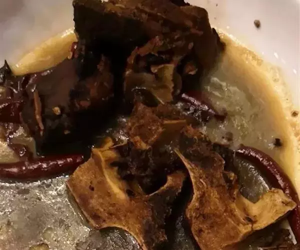 老做法是清汤羊蝎子,而流行的是浓汤羊蝎子。把整根的绵羊脊柱照着8到10厘米一段锯好后,用清水泡上10到12个小时,接着再煨上两小时料。这个料是各家的独门秘方,讲究点的据说要用到当归、陈皮等一共30多种材料。把羊蝎子用大火煮开后,再用小火咕嘟上3个小时。这还没完,还得再焖上5小时。最后,就着蒸腾的热气,羊蝎子终于可热闹上台了。