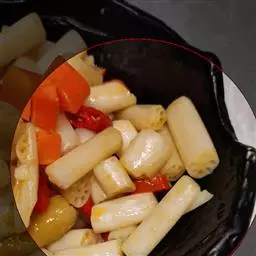 8.放入小辣椒和姜片葱段。