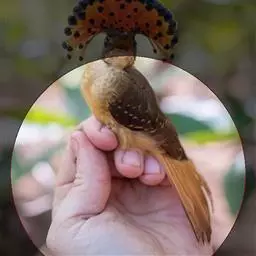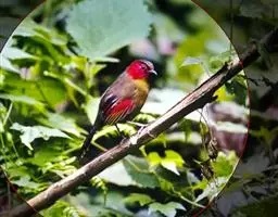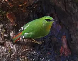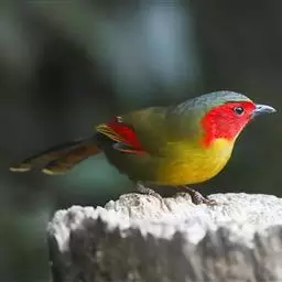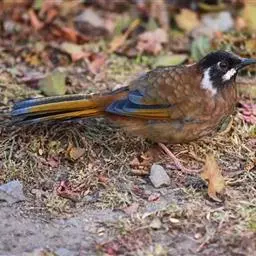 赤尾噪鹛中型鸟类,体长24~28厘米。头顶至后颈红棕色,两翅和尾鲜红色,眼先、眉纹、颊、颏和喉黑色,…